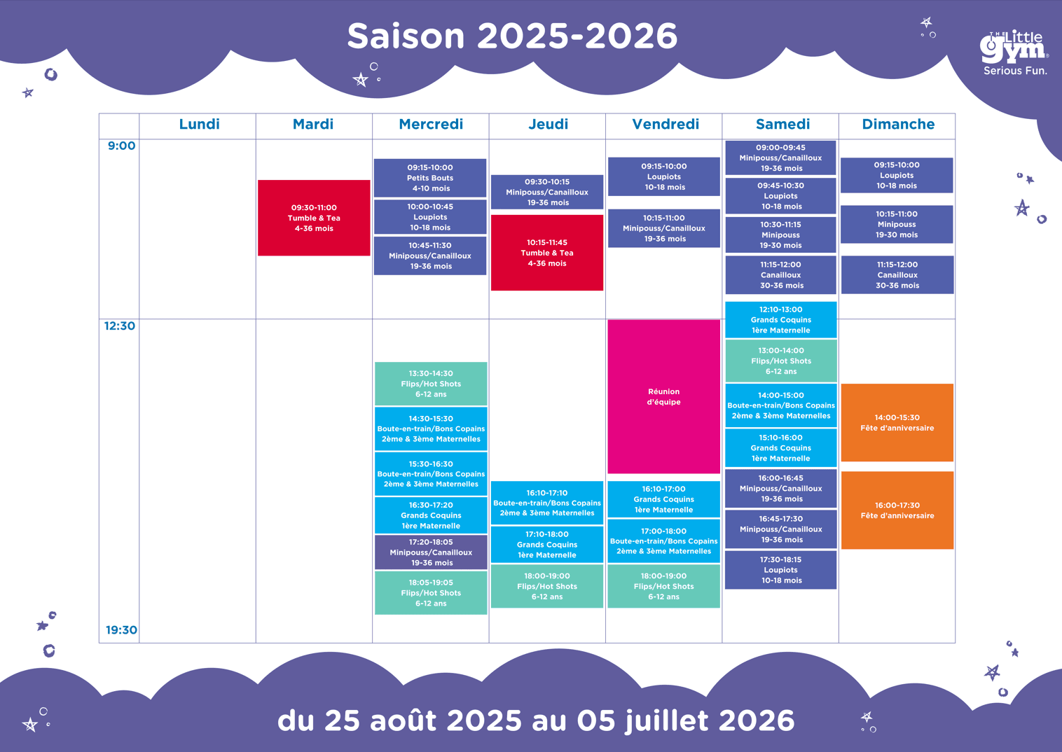 Notre fils y va depuis des années, il a commencé à 3 mois. Nous recommandons vivement la Little Gym.